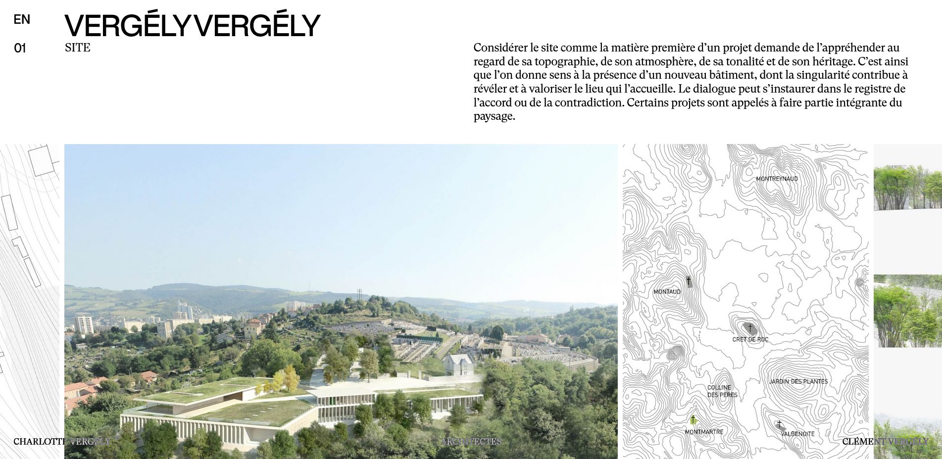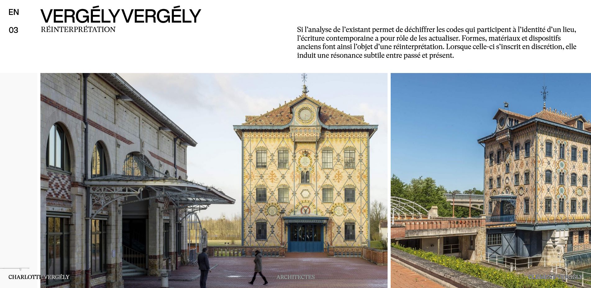 Charlotte Vergély et Clément Vergély développent une approche architecturale sensible dans des contextes patrimoniaux. Leur collaboration tient de l’articulation entre leurs démarches respectives : considérer le site comme la matière première de tout projet, interroger l’histoire pour la revisiter en termes contemporains. Leurs années de dialogue ont été mises en forme par l’agence Designers Unit à travers un site web et une brochure. Les textes éclairent les points de convergence qui nourrissent leurs réflexions communes.